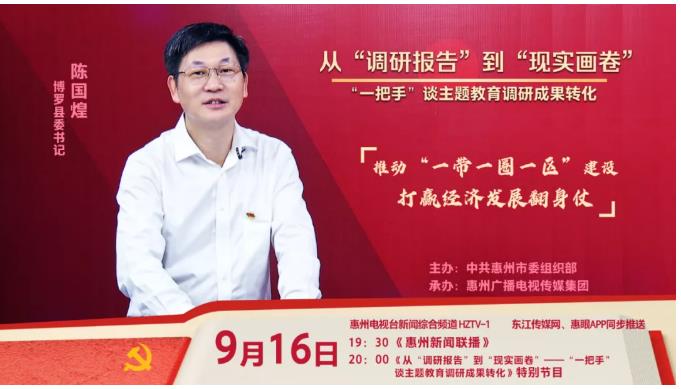 16日晚8點,第三期《從“調研報告”到“現(xiàn)實畫卷”——“一把手”談主題教育調研成果轉化》節(jié)目在惠州電視臺一套新聞綜合頻道播出。博羅縣委書記陳國煌圍繞主題教育對博羅發(fā)展思路的調整,博羅如何打贏經(jīng)濟翻身戰(zhàn),與惠州電視臺主持人展開對話。