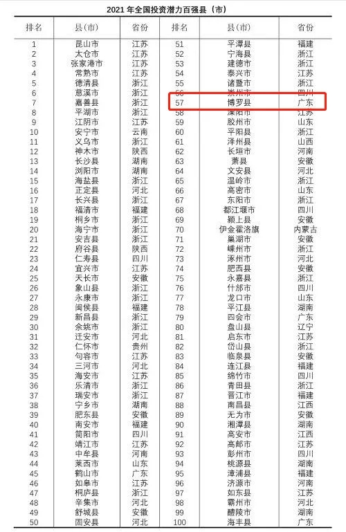 近日,“2021年全國(guó)投資潛力百?gòu)?qiáng)縣(市)報(bào)告”在京發(fā)布。根據(jù)報(bào)告,博羅縣以第57名的排位,入圍2021年全國(guó)投資潛力百?gòu)?qiáng)縣。