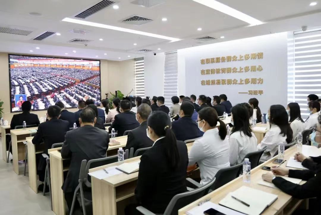▲縣委組織部、縣婦聯(lián)組織全體黨員干部在縣黨群服務(wù)中心集中收看開幕大會(huì)直播。